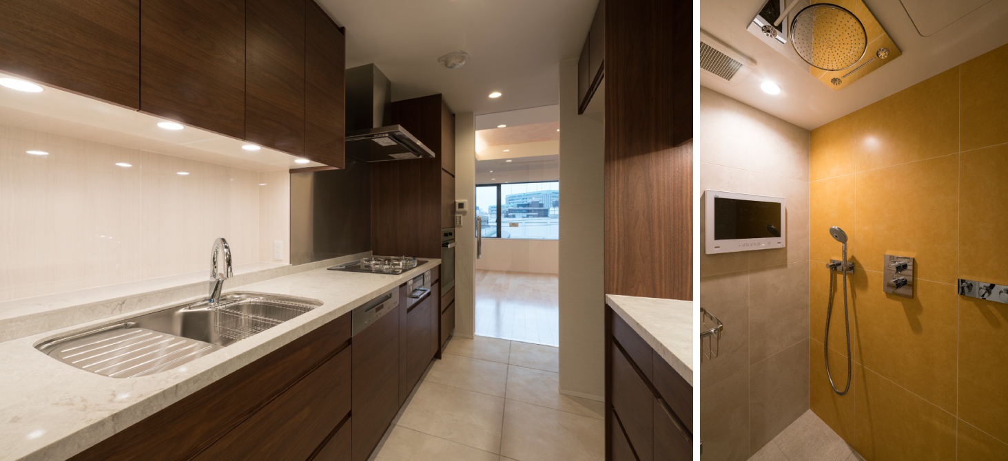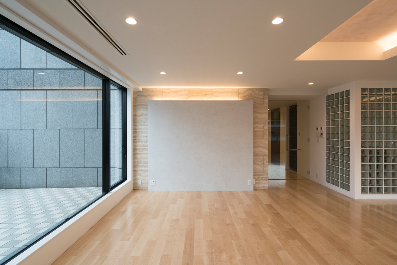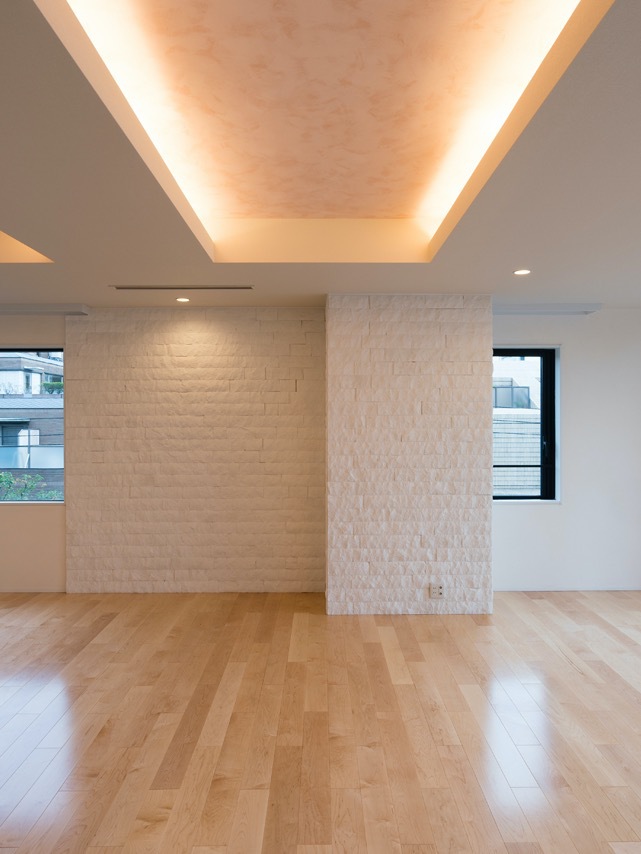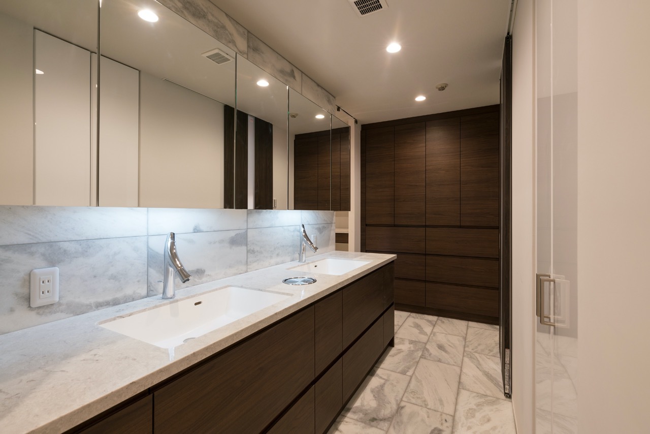 市ヶ谷の高級住宅地に建つ「クレストコート砂土原」を購入されたAさんの依頼で全面リフォームを行いました。購入された住戸の専有面積が220m2と都内でも最高クラスのマンションです。設計期間中はお客様とショールームを訪問し、フルオーダーするシステムキッチンやバスルームの仕様について打合せを重ねていきました。システムキッチンや洗面化粧台はクチーナ東京のフルオーダー、ジャクソンの浴槽を採用した2022サイズのオーダーバスルームを東京バススタイルに製作を依頼しました。インテリアには天然素材である大理石のトラバーチン・はつり大理石・御影石・イタリア漆喰や珪藻土を贅沢に採用しております。
