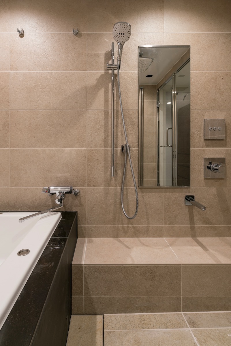 マスターベットルームには専用のパウダールームとシャワーブースを併設しております。ハンドシャワーの他に大型で多機能なオーバーヘッドシャワー。このクラスのオーバーヘッドはコスト面でホテルの客室には採用していないと思います。右側の画像は主寝室のベッドヘッドの壁面になります。ベッドに座り壁にもたれた際、柔らかさを感じてもらう為に、下地にウレタンを用いて仕上げはレザーで張り上げております。
