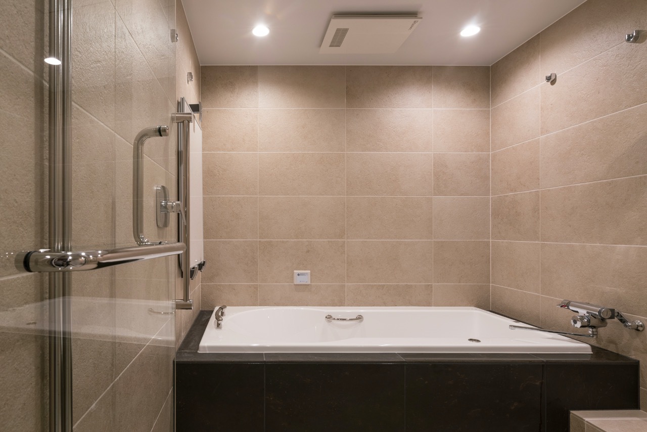 特大のユニットバスルームは東京バススタイルにて2022サイズの特注品。浴槽はジャクソンのネオベンティU。壁面と床には大判のタイルを採用。ドアはテンパーガラスドア、水栓アクセサリーもお客様がこだわられたアイテムの一つ。