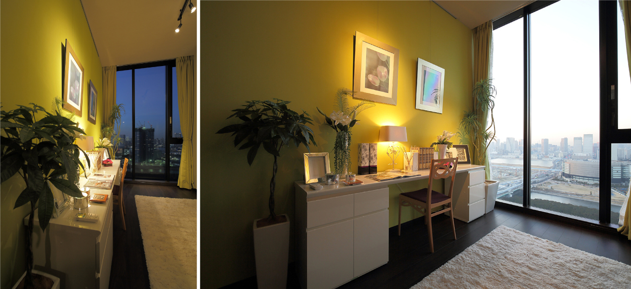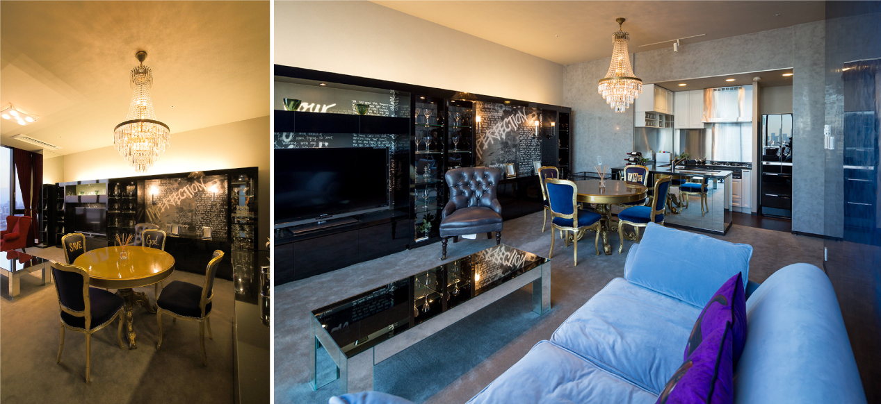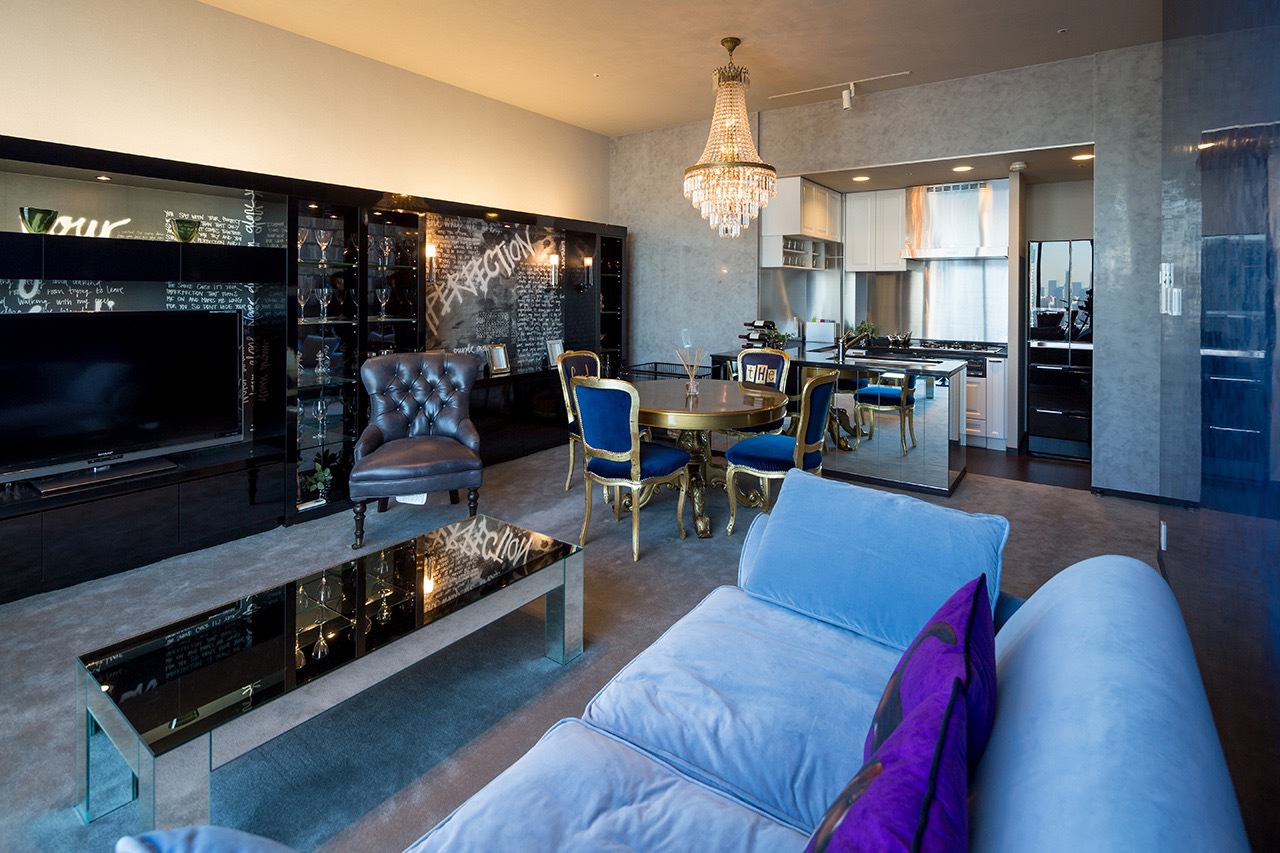 有明の湾岸エリアの地上30階のタワーマンションを購入されたKさんの依頼でリノベーションを行いました。別宅として休日を過ごすための「Relax クール」が空間のコンセプト。素材は壁の「カラーペイント,スタッコアンティコ」を中心に、ライティングの間接照明の光の陰影で空間を包みこみ、リビングのシャンデリアでラグジュアリーを強調しています。