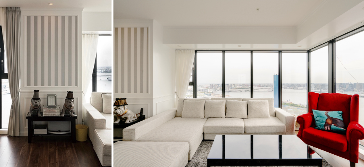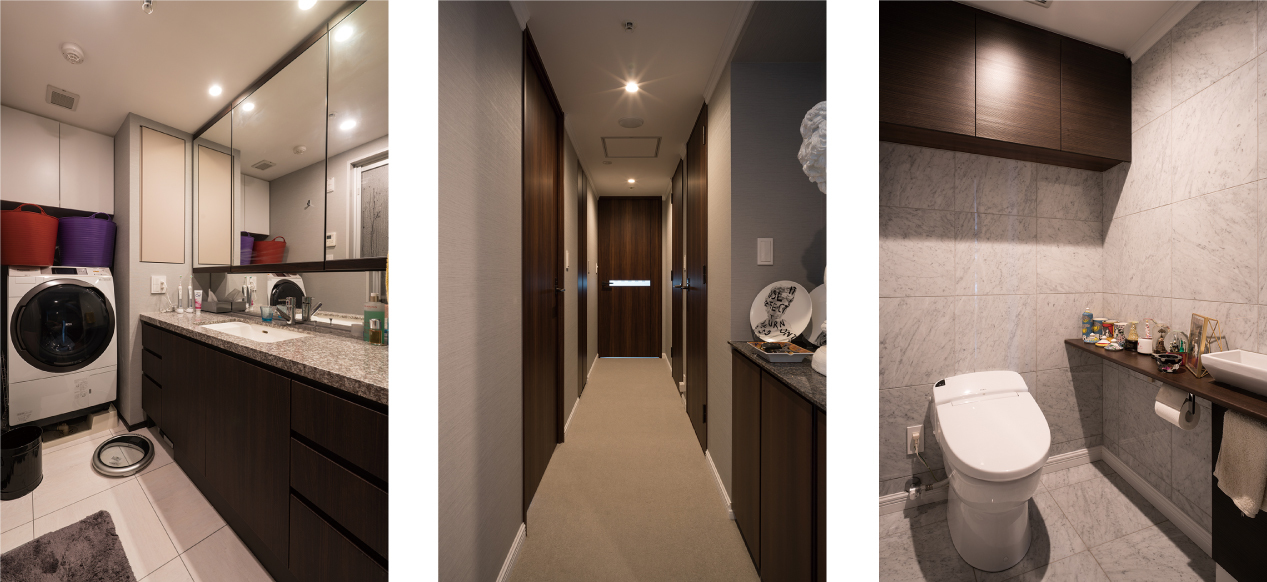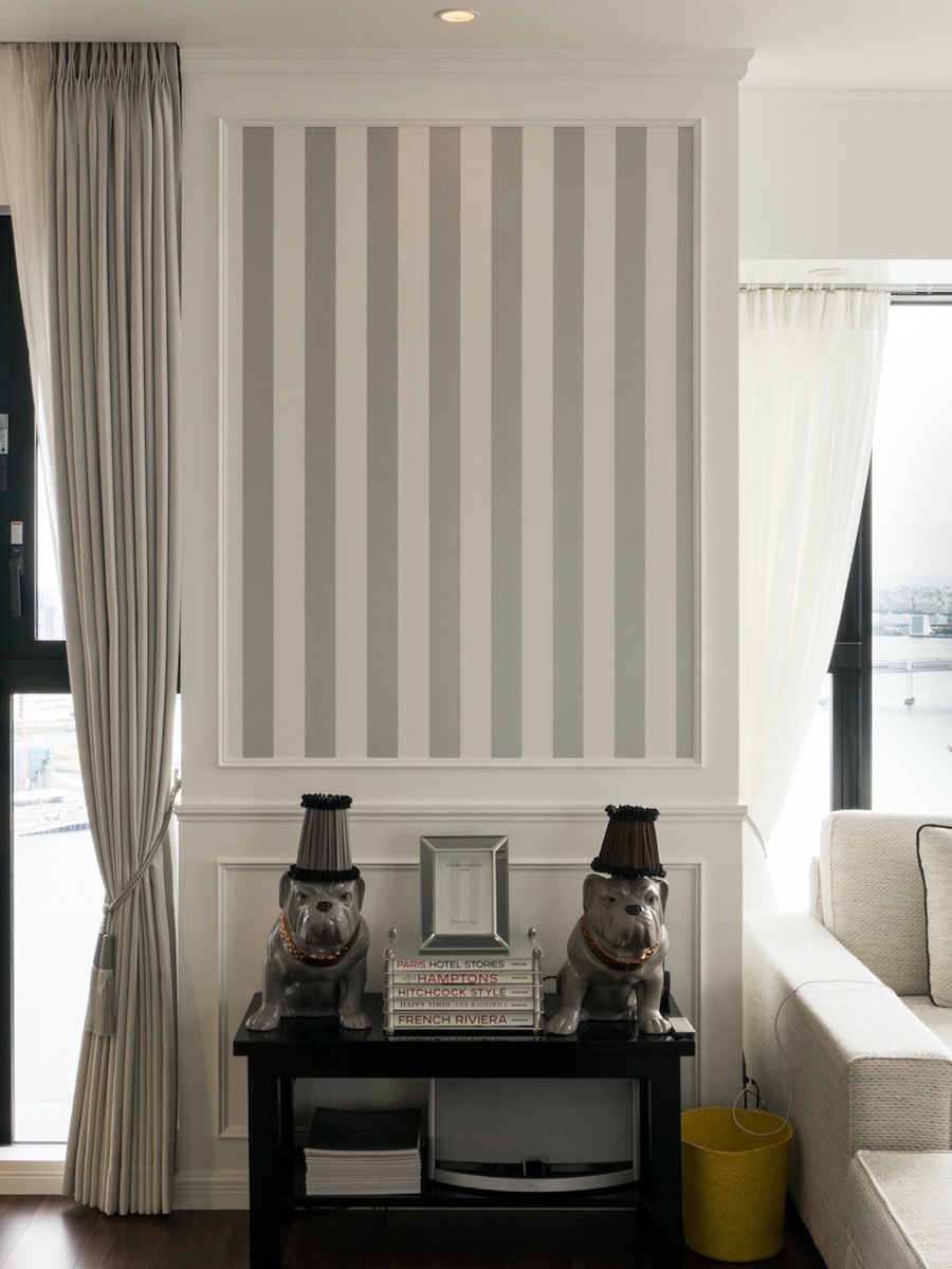 全体的なインテリアは2016年のトレンドカラーの白を基調としながら、壁面造作のモールディングを採用することでLuxuryに演出しています。壁面造作の腰壁は、簡易的にモールディングを貼付けただけの造作とは異なり、木質系パネルを腰壁部に増し張りすることで壁面よりも厚みを持たせています。四方をモールディングに囲まれたスペースにはストライプ柄の輸入壁紙を採用。壁の塗料はホワイトハウスでも指定されているというベンジャミンムーアを汚れ防止を考慮して5分艶で採用。塗装下地にはワンダーペーパーをクロスの替わりに貼っています。
