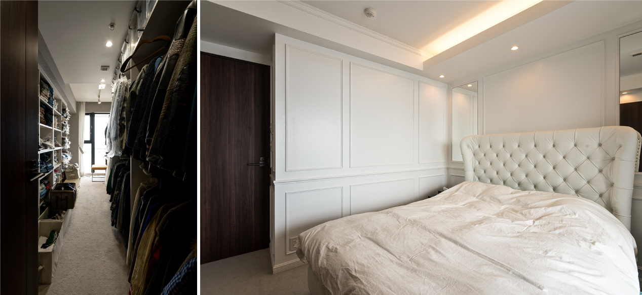 ベッドルームの床にはカーペットを敷き込んでいます。カラーリングはリビングと比較してより白く、明るく爽やかな印象を持ちます。左側の画像は洋室6.5帖を1室分利用したクロゼットルームです。たくさんのお洋服がオーダーでお作りしたシェルフやオープンクロゼットに収納されています。