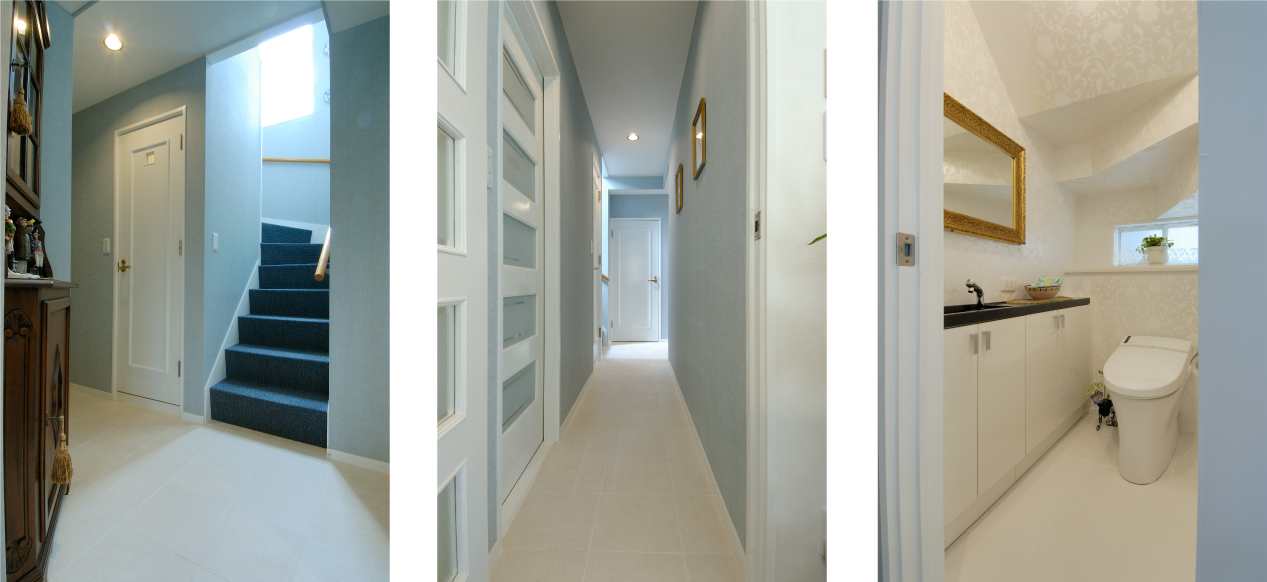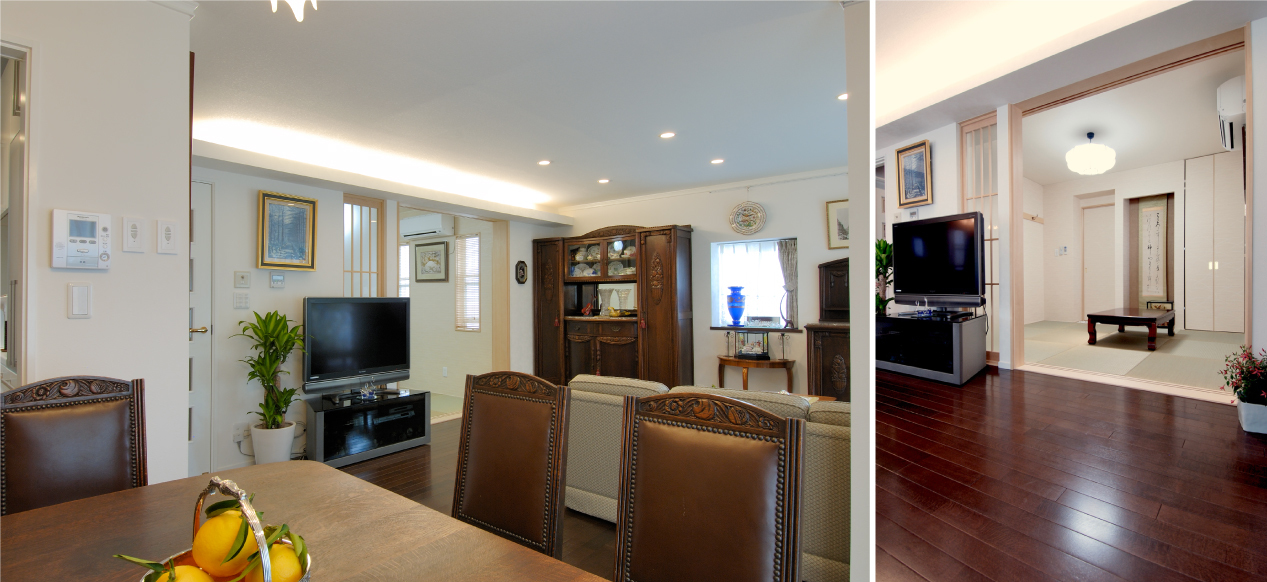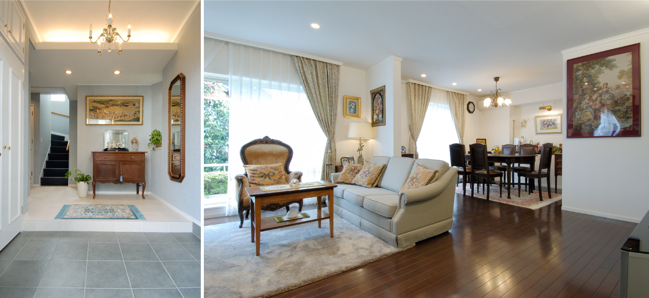 築19年の一戸建ての全面リフォームを行ったMさん。LDKが2階、各寝室が一階という間取りを来客用に逆転させたいという事が大きな理由でした。海外赴任の際にご夫妻が経験したヨーロッパの生活空間を取り入れることがリフォームのコンセプト。品格があるクラッシックなテーストで統一しているM邸のインテリア。部屋ごとに素材や色柄が異なる壁や床の仕上げで空間をコーディネート。一見、デザイン性を重視したリフォームのように見受けられますが機能面においても「断熱・防犯・バリアフリー対策」を行っていますので、長く愛せる家へとリフォームを行う事ができました。
