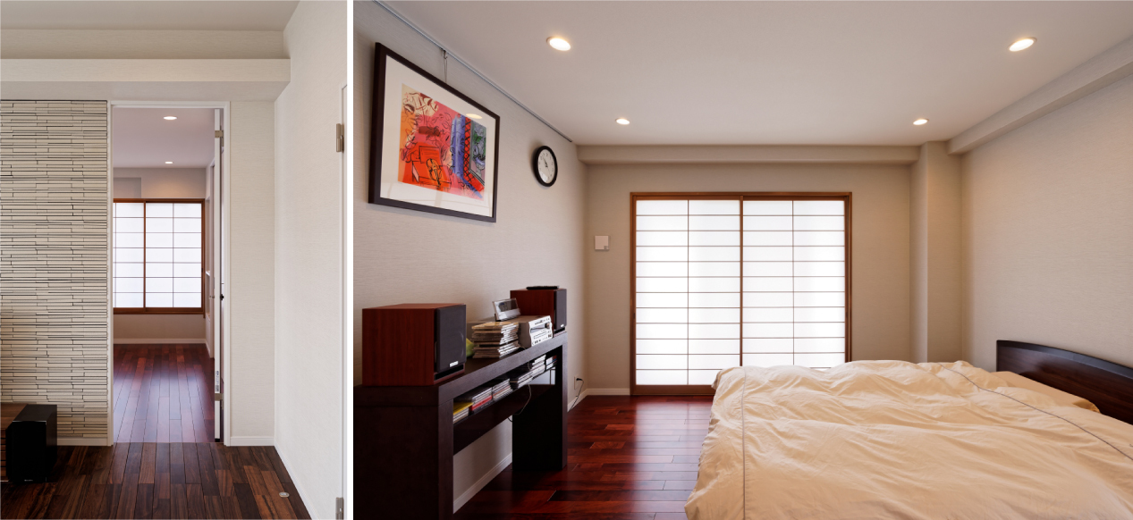 寝室の床はカリンの無垢フローリングを採用しています。既存の床には目視ではわかりずらい床の不陸(高低差)がありましたのでレベラーによって床の下地高さの調整を行った後に大工さんに無垢床材を施工してもらいました。