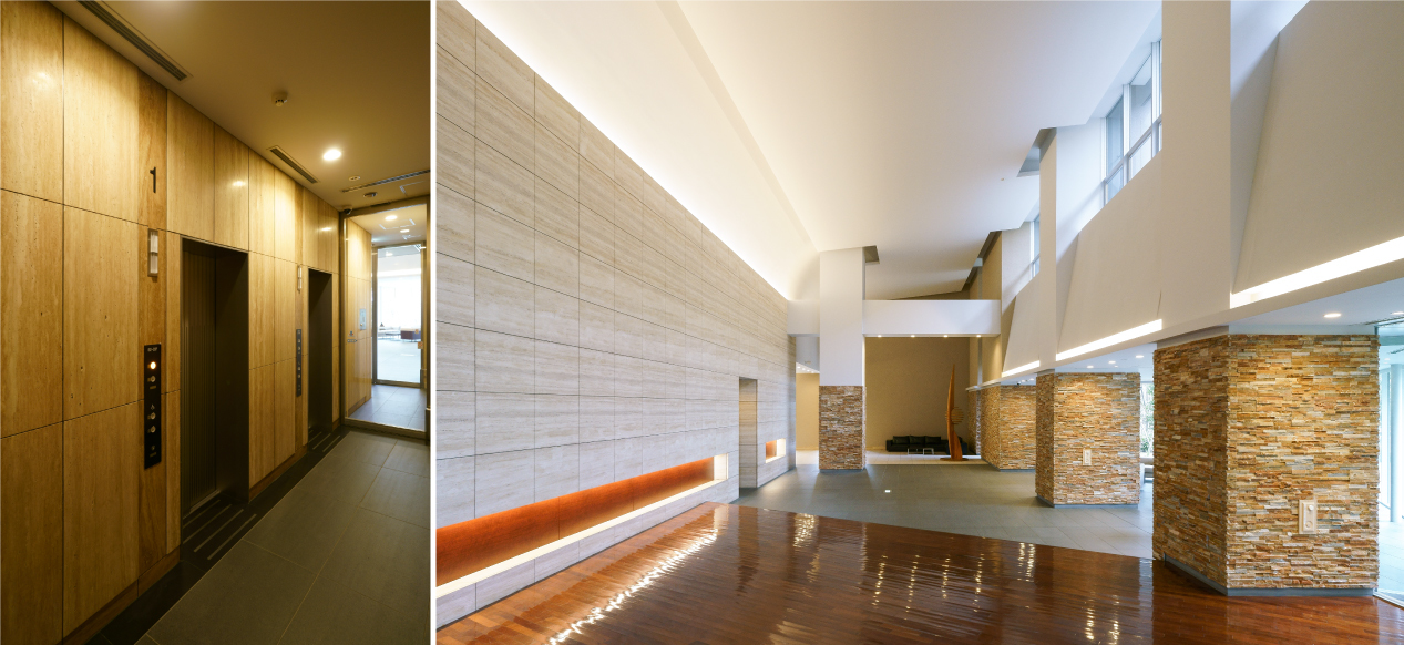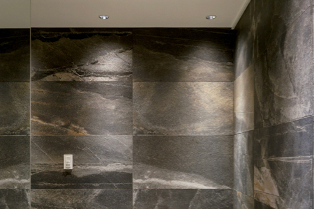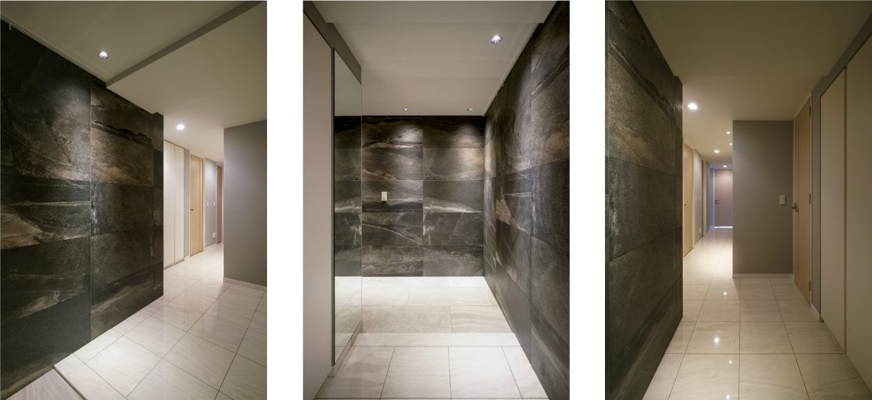 エントランスの壁面には45cm×90cmの大判のタイルを採用。イタリアを代表する山々から取れる石材の色柄をモチーフに、高度なプリント技術によってリアルな天然石の質感に仕上げられています。