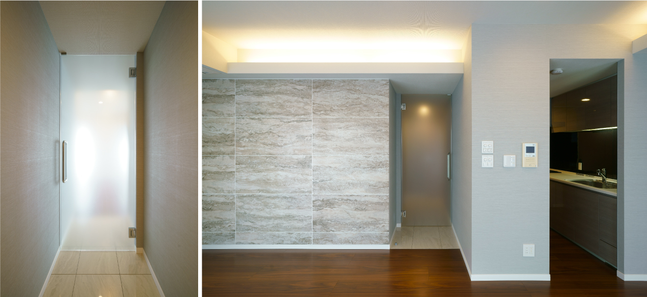 リビング照明は天井間接照明と最新のLEDダウンライトを採用。ライトコントロールで明るさの強弱を自由に調光できます。空調システムは壁掛けエアコンからインテリアのデザイン性を損なわない天井カセット型のハウジングエアコンに交換しています。小さなお子さんの為にガラスのテンパードアの丁番にはソフトクローズ機能を持たせ、扉と壁の1cmの隙間には指を挟まないようにゴム製のエッジシールを戸先と吊元に設置しています。