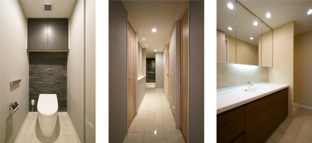 パウダールームの洗面化粧台やシステムキッチンの扉は代官山のクチーナに依頼をしてコンバージョンしています。トイレは割肌の天然石を空間のアクセント、便器は高性能でデザイン性も高いネオレストAHを採用しています。