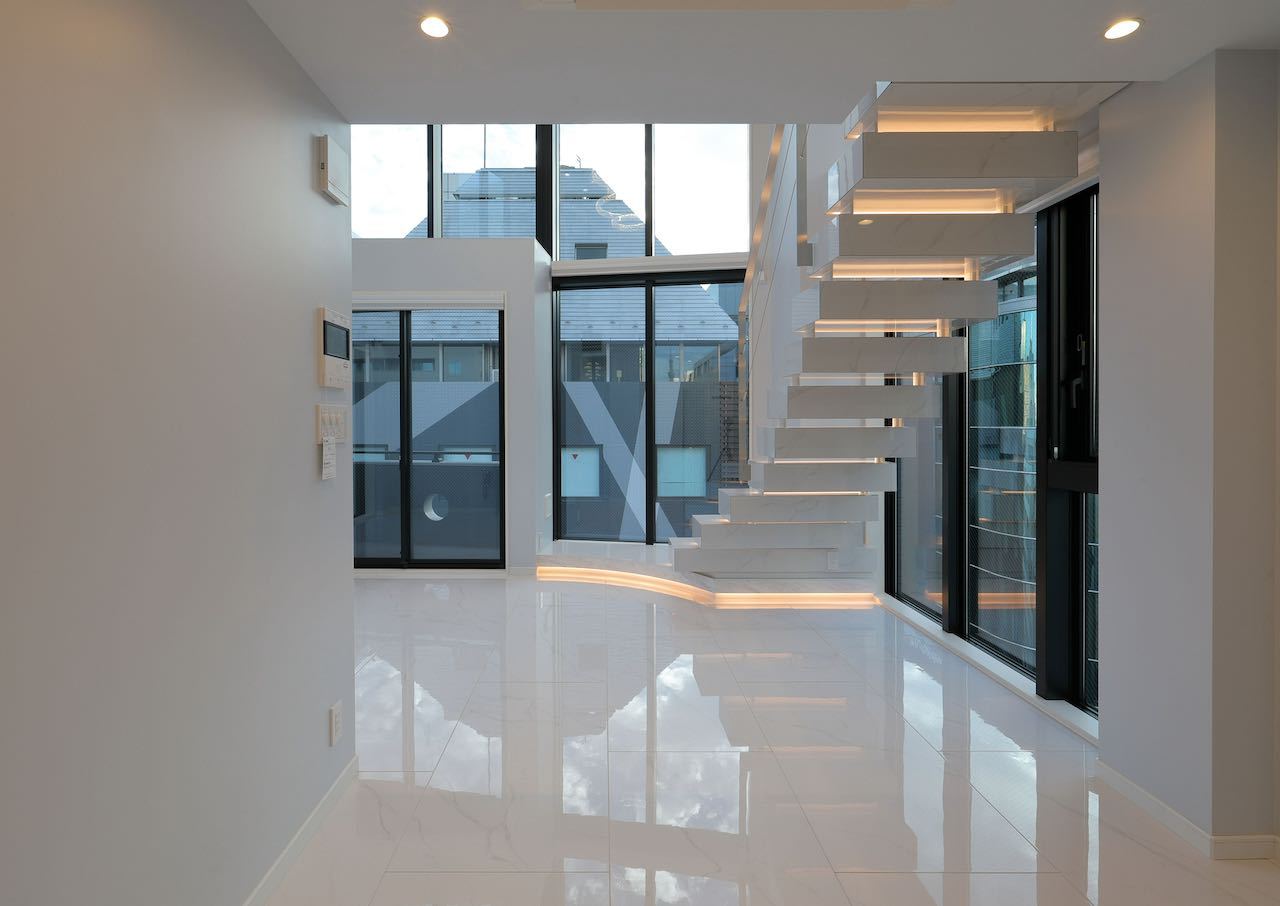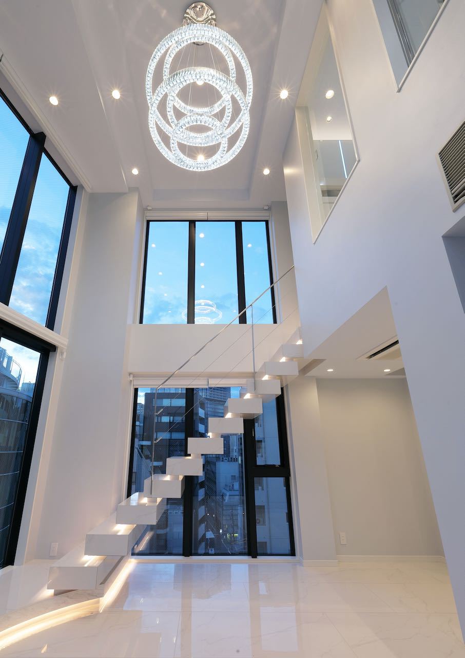 継続クライアントのU様よりご自身で企画/開発された9階建新築マンションのデザイン設計を依頼された物件です。お客様がお住まいになる最上階のメゾネット住戸の「基本設計・照明計画・インテリア」のデザイン総合監修を弊社で行いました。天井高5mを超えるリビングの照明計画は、光の配光に注意をして器具の選定を行いました。また梁が露出するキッチンには間接照明を造作することで、光の演出性だけではなく空間のデザイン性を高める試みとなっています。