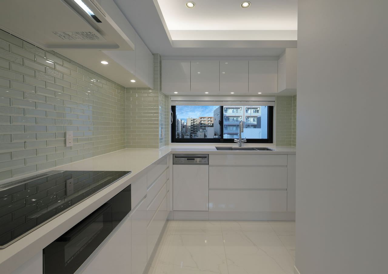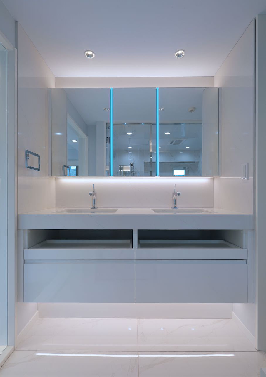 インテリアは白で統一。素材の艶の質感を「グロスとマット」で使い分けることで、短調にならずに空間をラグジュアリーに演出している。重要なオーダーキッチンやバスルームのオーダー洗面台・システム収納・ブラインド工事は弊社で設計から施工までを行った。
